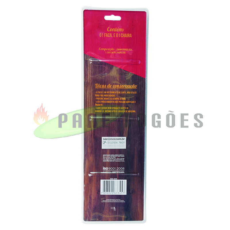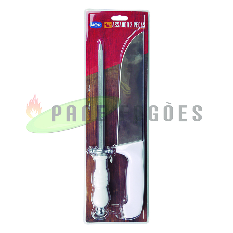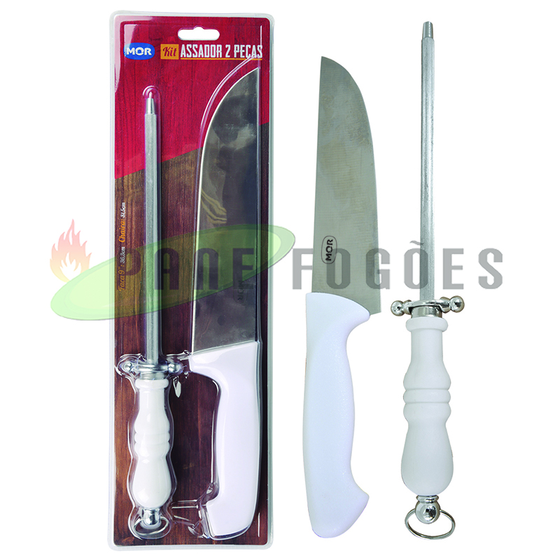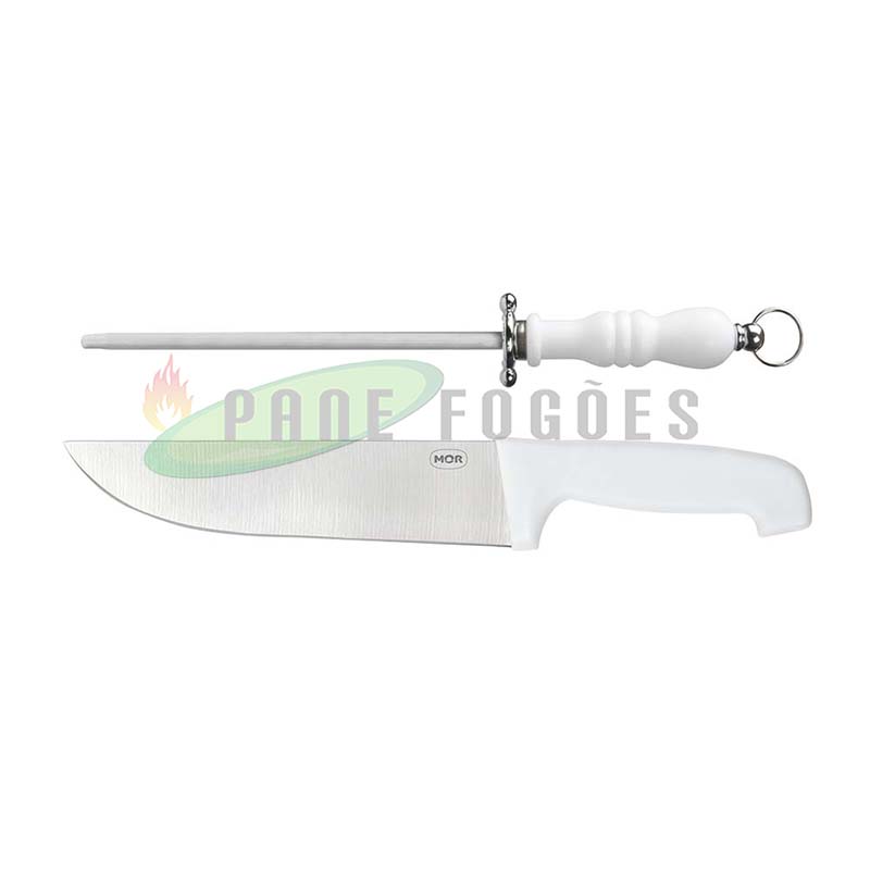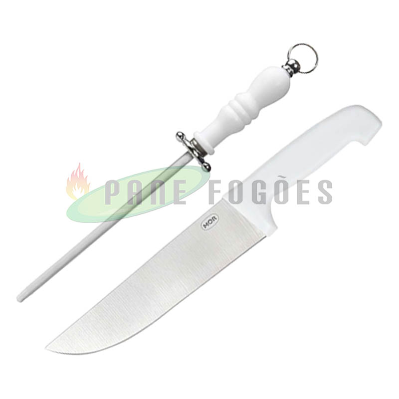 Kit: 1 Faca (36,5 cm comprimento (c) x 5,2 cm largura (l) / 1 Chaira (32,5 cm comprimento (c) x 4,4 cm largura (l)