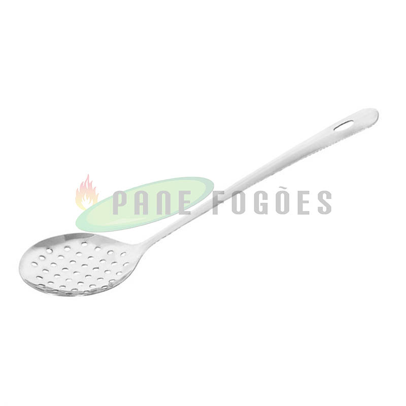 A espumadeira inox 5 estrelas possuí cabo inteiriço e longo, evitando assim o desprendimento com o uso e o aquecimento excessivo, além de ser um produto antioxidante, seu uso é recomendado para servir alimentos como arroz ou no preparo de frituras.
